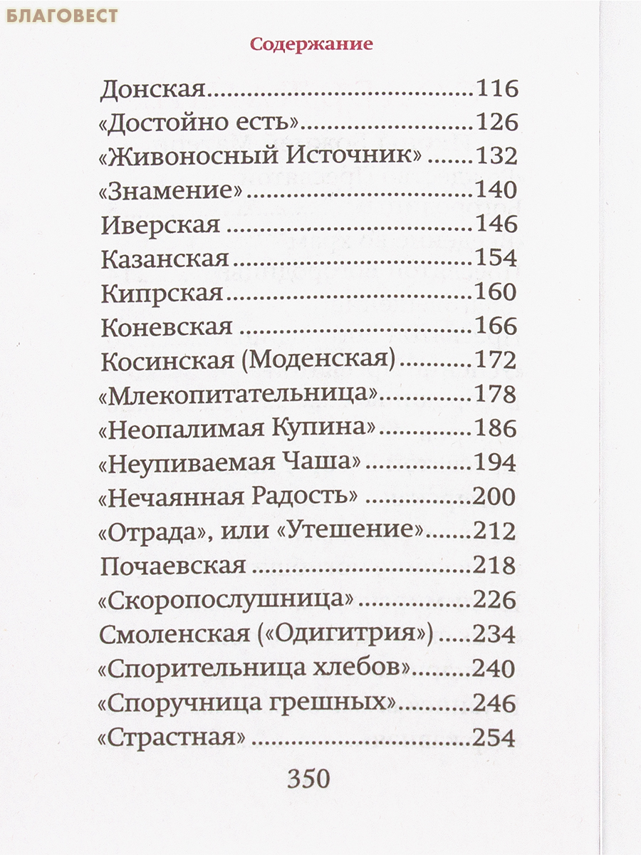 Книга содержит тропари, кондаки, величания и молитвы перед 44 наиболее известными чудотворными иконами Пресвятой Богородицы. Также в ней рассказывается о происхождении этих икон и о том, где сейчас находятся подлинники; о дате празднования в честь того или иного образа в Православной Церкви.
