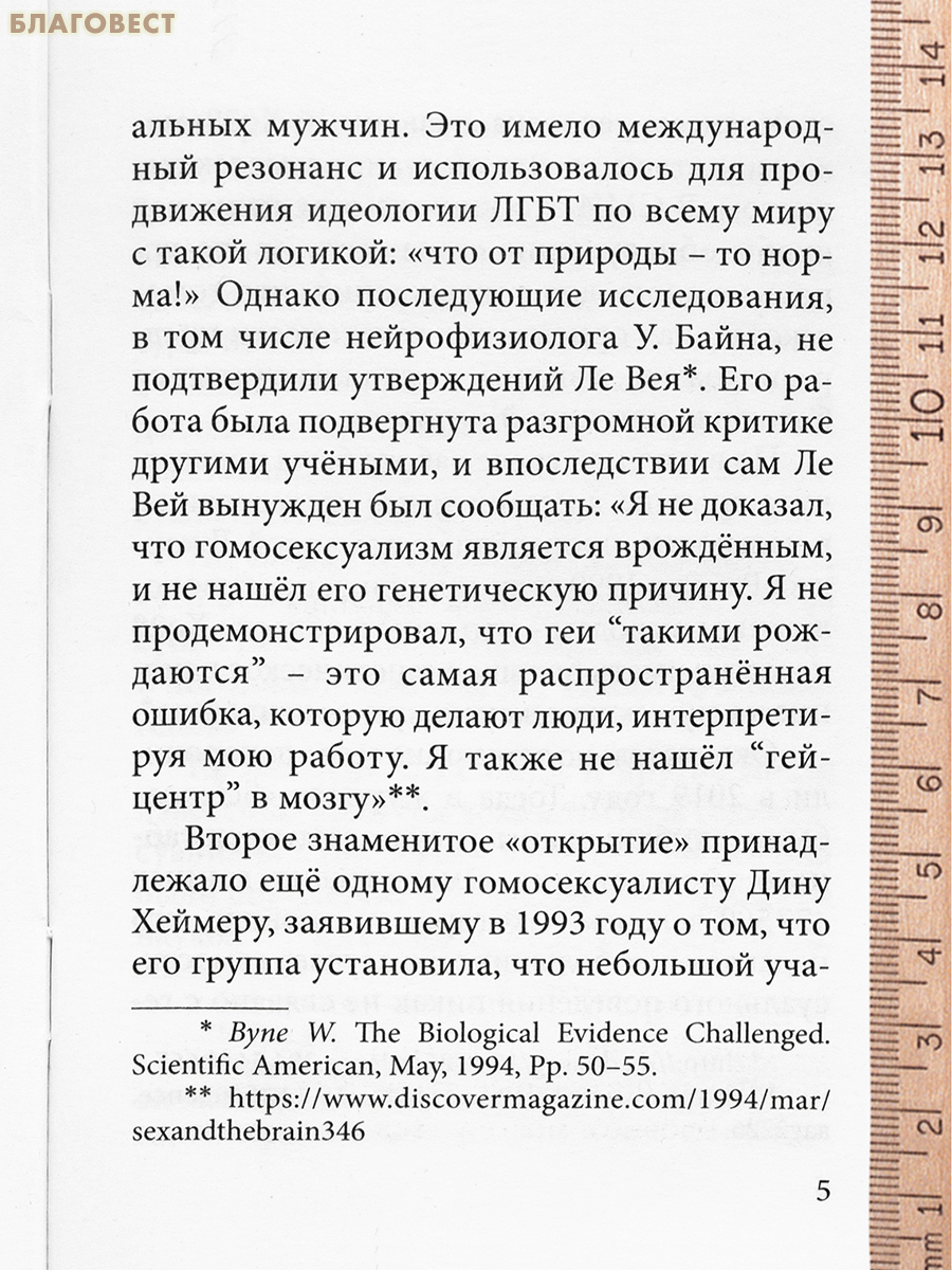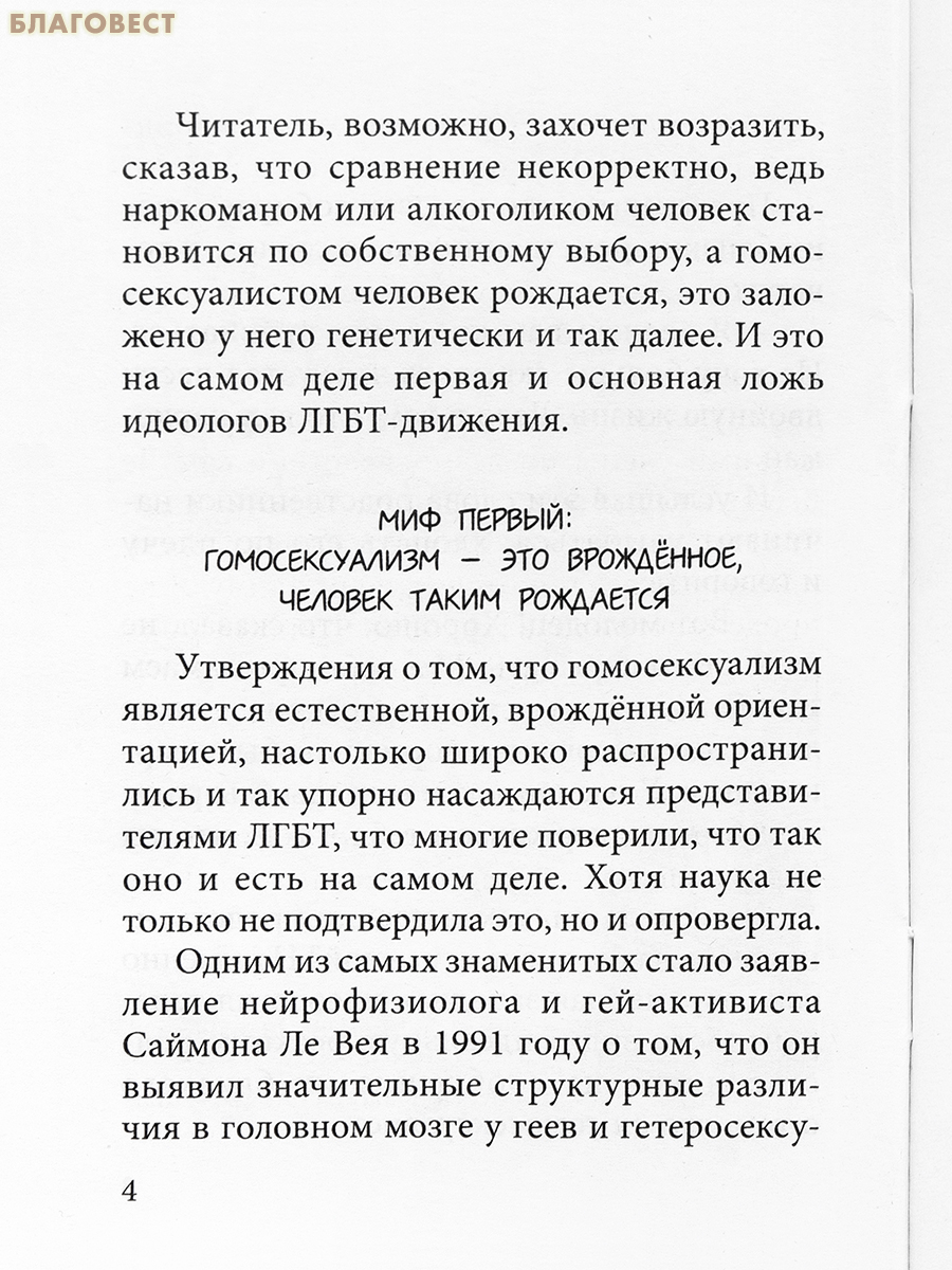 Прочитав эту брошюру, вы узнаете о гомосексуализме то, чего точно не знали ранее и о чём предпочитают умалчивать ЛГБТ*-пропагандисты. Здесь будут представлены факты, результаты научных исследований и мнения экспертов, которые, вполне возможно, серьёзно скорректируют ваше представление о данном явлении. В особенности если вы испытали влияние активно продвигаемой ныне идеологии, согласно которой гомосексуализм – это безвредная для человека и общества вариация нормы, якобы от природы заложенная в геях, а все несогласные с этим – отсталые фанатики-мракобесы и человеконенавистники, не имеющие никаких аргументов, кроме собственных предрассудков.