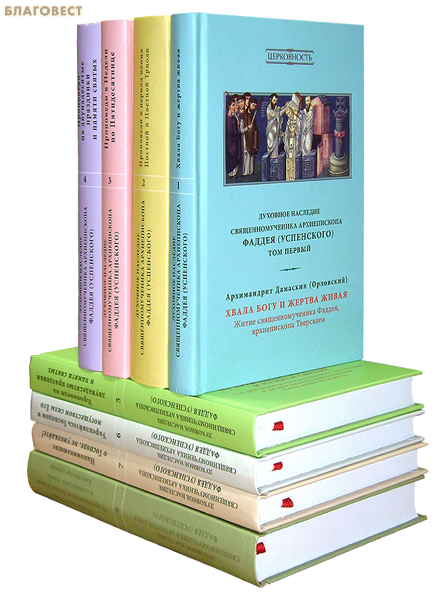 В серии книг «Церковность», рассказывающих о жизни и подвиге новомучеников Церкви Русской, публикуется собранное воедино духовное наследие владыки Фаддея. В этих томах дать возможность каждому желающему прикоснуться к тому опыту жизни во Христе, который стяжал священномученик Фаддей. Восьмитомный сборник духовного наследия владыки Фаддея — воистину дар Божий современным христианам. Через проповеди, статьи, педагогические размышления святителя-мученика мы можем погрузиться в самые глубины его христоподражательной души, от первого лица услышать, чем жил этот выдающийся православный подвижник, от своего сердца вещающий нашему сердцу как жить для Христа и с Ним связать всю свою жизнь.