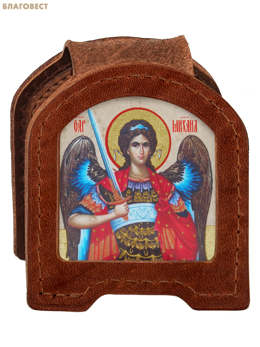 Икона дорожная раскладная Архангел Михаил (натуральная кожа). Цвет коньяк