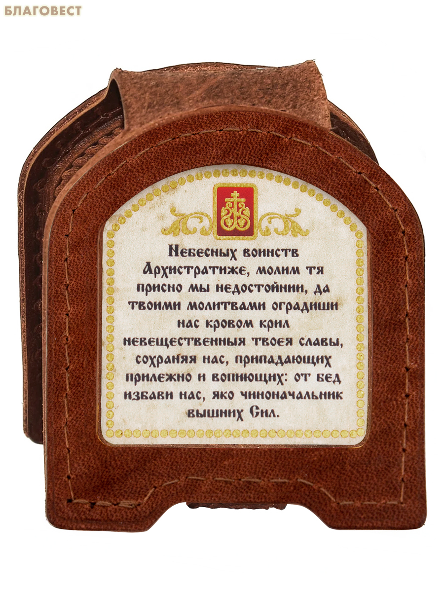 Икона дорожная раскладная Архангел Михаил. Цвет коньяк. Обложка изготавливается из натуральных сортов кожи и имеет удобную складывающуюся конструкцию, которая надежно обеспечивает сохранность размещенных в ней изображений во время транспортировки. Дополнительной особенностью такой конструкции является наличие в ней универсальной кнопки-застежки, которая в случае обратного перестегивания хлястика, позволяет удерживать установленную на стол открытую икону в устойчивом вертикальном положении.
