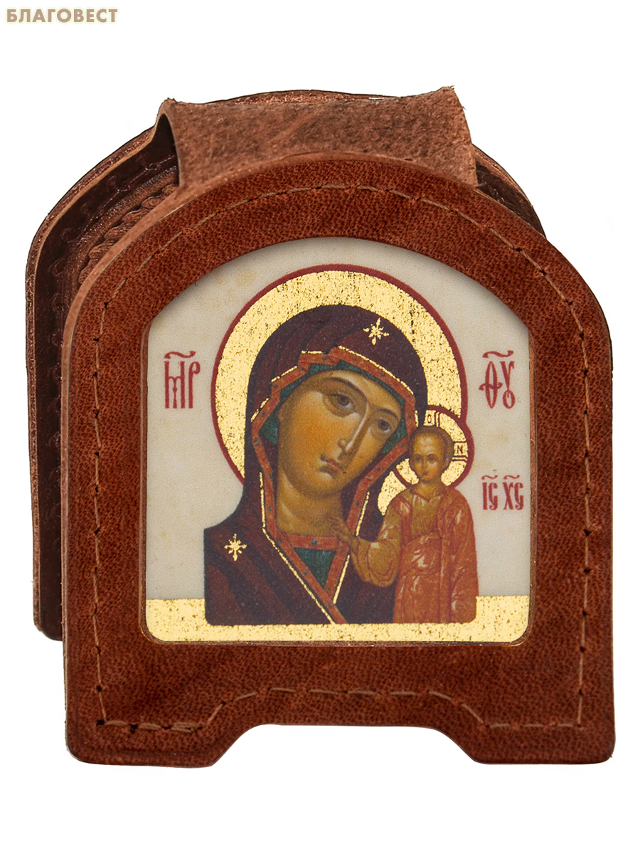 Икона дорожная раскладная Пресвятая Богородица «Казанская» (натуральная кожа). Цвет коньяк