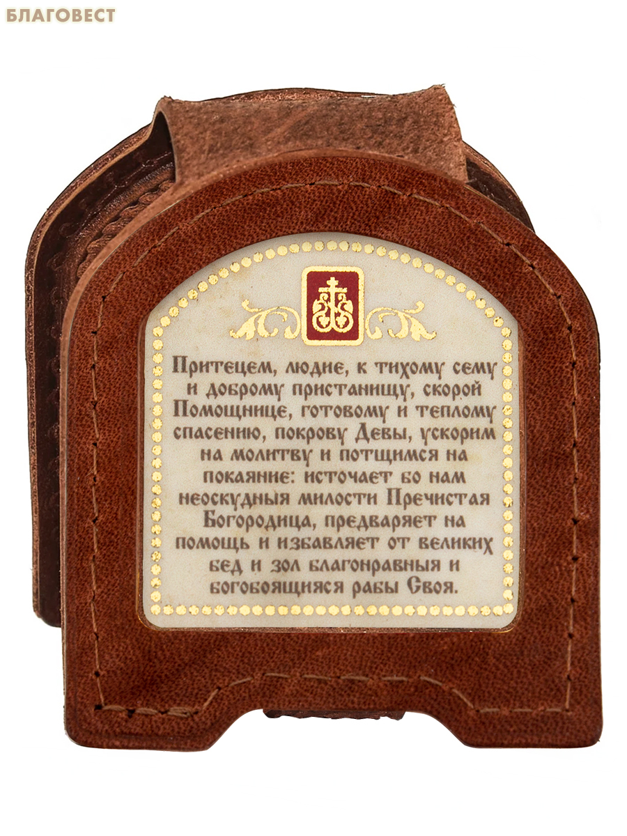 Икона дорожная раскладная Пресвятая Богородица «Казанская». Цвет коньяк. Обложка изготавливается из натуральных сортов кожи и имеет удобную складывающуюся конструкцию, которая надежно обеспечивает сохранность размещенных в ней изображений во время транспортировки. Дополнительной особенностью такой конструкции является наличие в ней универсальной кнопки-застежки, которая в случае обратного перестегивания хлястика, позволяет удерживать установленную на стол открытую икону в устойчивом вертикальном положении.