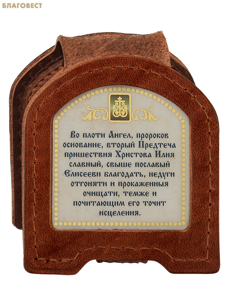 Икона дорожная раскладная «Пророк Илия». Цвет коньяк. Обложка изготавливается из натуральных сортов кожи и имеет удобную складывающуюся конструкцию, которая надежно обеспечивает сохранность размещенных в ней изображений во время транспортировки. Дополнительной особенностью такой конструкции является наличие в ней универсальной кнопки-застежки, которая в случае обратного перестегивания хлястика, позволяет удерживать установленную на стол открытую икону в устойчивом вертикальном положении.