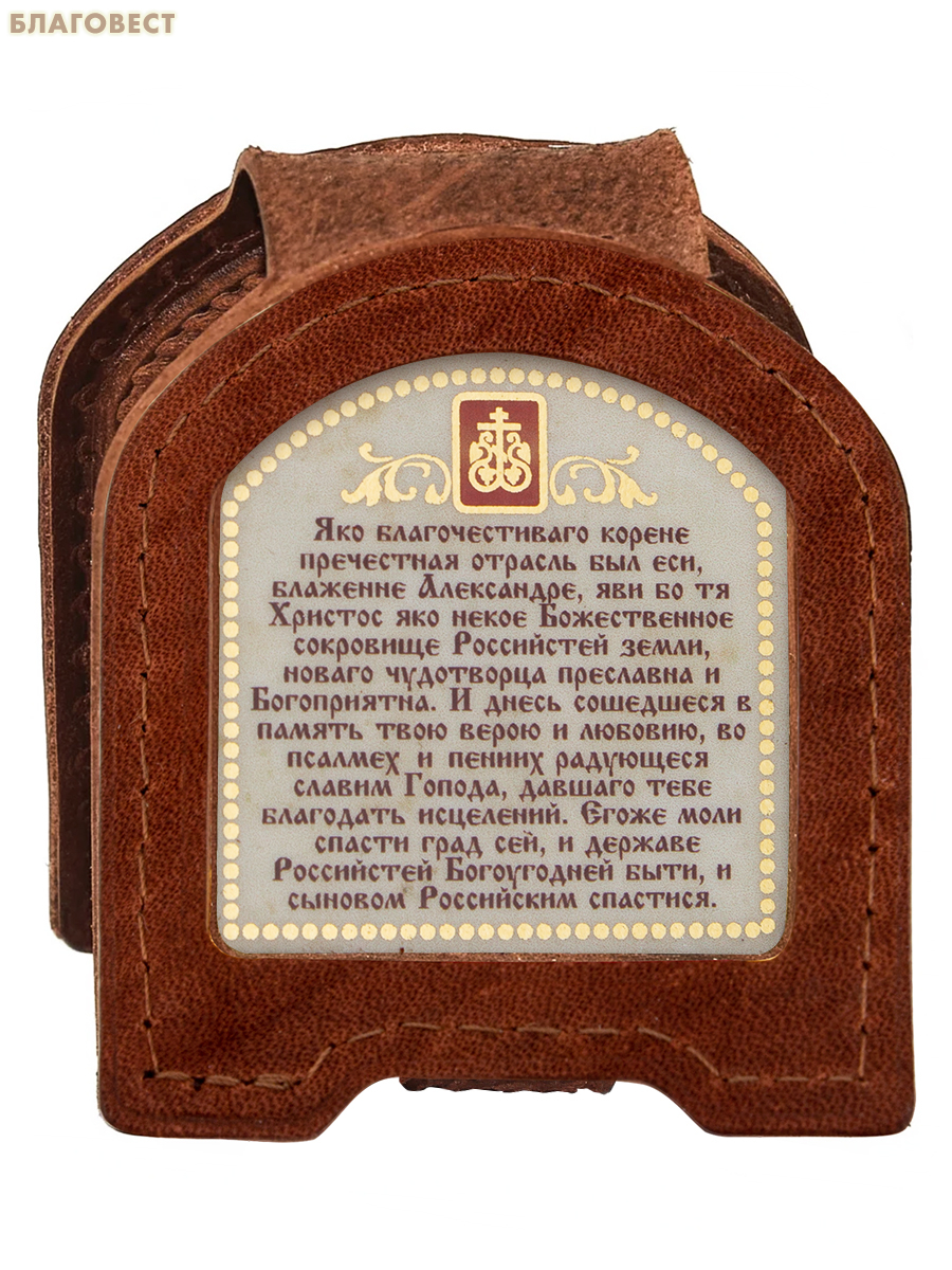 Икона дорожная раскладная «Святой благоверный князь Александр Невский». Цвет коньяк. Обложка изготавливается из натуральных сортов кожи и имеет удобную складывающуюся конструкцию, которая надежно обеспечивает сохранность размещенных в ней изображений во время транспортировки. Дополнительной особенностью такой конструкции является наличие в ней универсальной кнопки-застежки, которая в случае обратного перестегивания хлястика, позволяет удерживать установленную на стол открытую икону в устойчивом вертикальном положении.