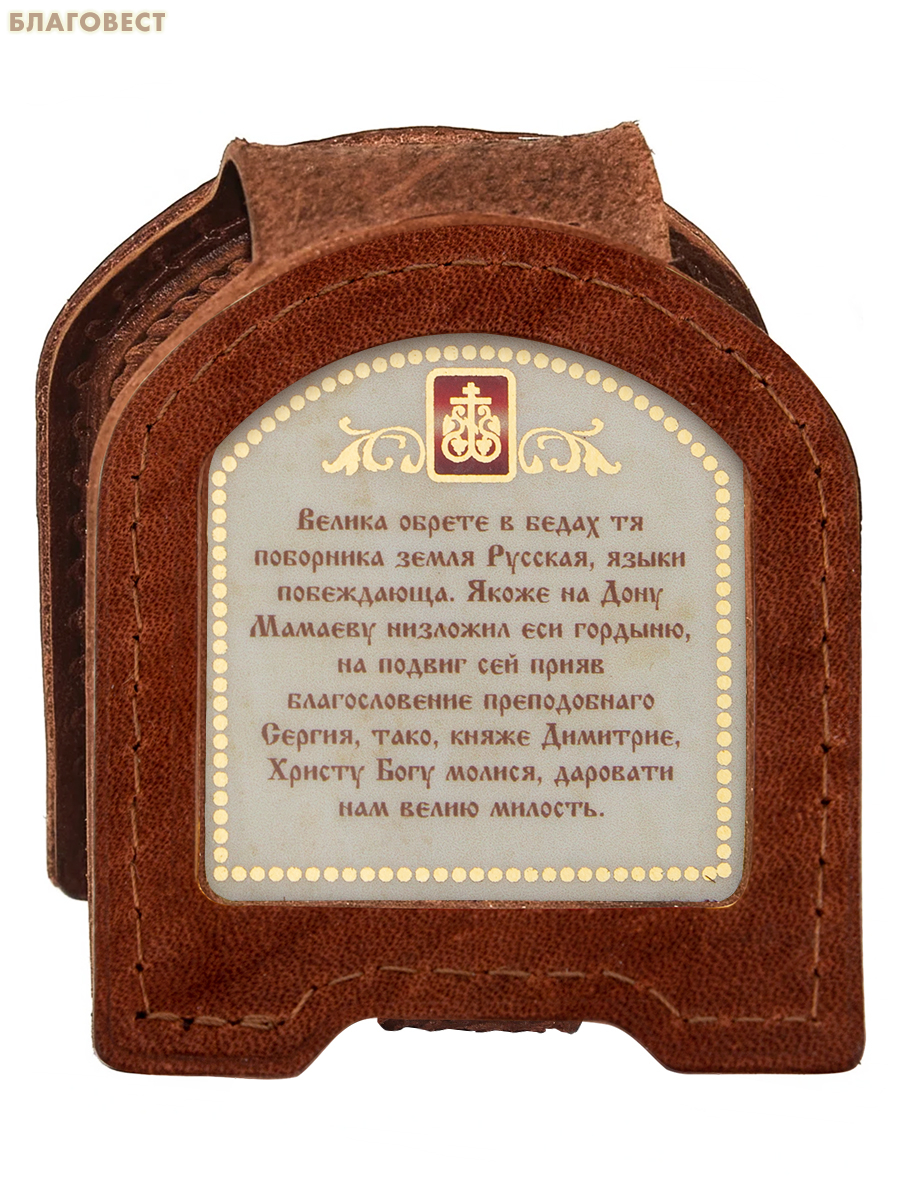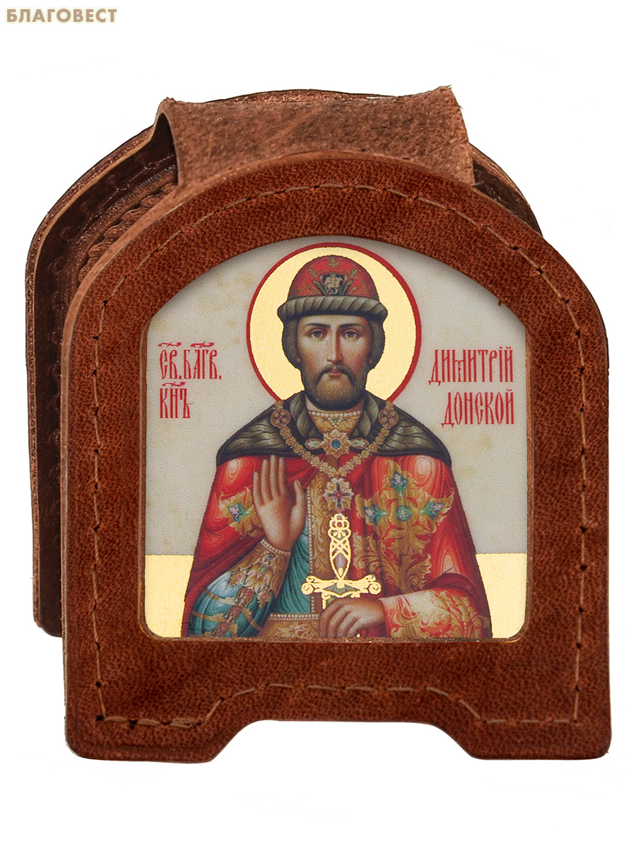 Икона дорожная раскладная «Святой благоверный князь Дмитрий Донской». Цвет коньяк. Обложка изготавливается из натуральных сортов кожи и имеет удобную складывающуюся конструкцию, которая надежно обеспечивает сохранность размещенных в ней изображений во время транспортировки. Дополнительной особенностью такой конструкции является наличие в ней универсальной кнопки-застежки, которая в случае обратного перестегивания хлястика, позволяет удерживать установленную на стол открытую икону в устойчивом вертикальном положении.
