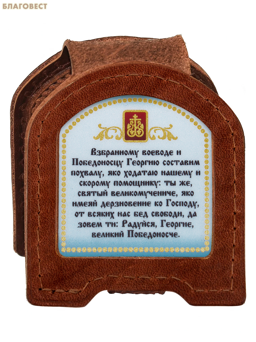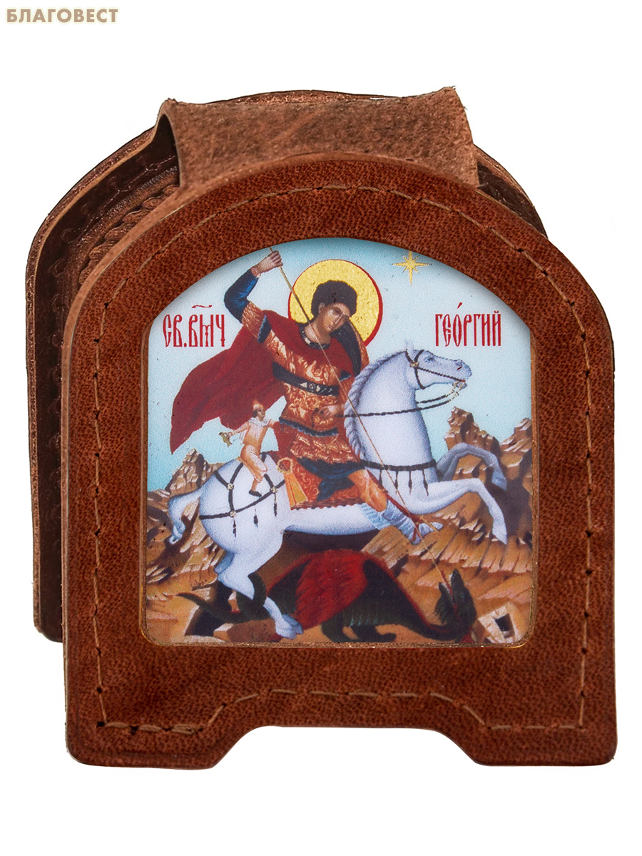 Икона дорожная раскладная Святой великомученик Георгий Победоносец. Цвет коньяк. Обложка изготавливается из натуральных сортов кожи и имеет удобную складывающуюся конструкцию, которая надежно обеспечивает сохранность размещенных в ней изображений во время транспортировки. Дополнительной особенностью такой конструкции является наличие в ней универсальной кнопки-застежки, которая в случае обратного перестегивания хлястика, позволяет удерживать установленную на стол открытую икону в устойчивом вертикальном положении.