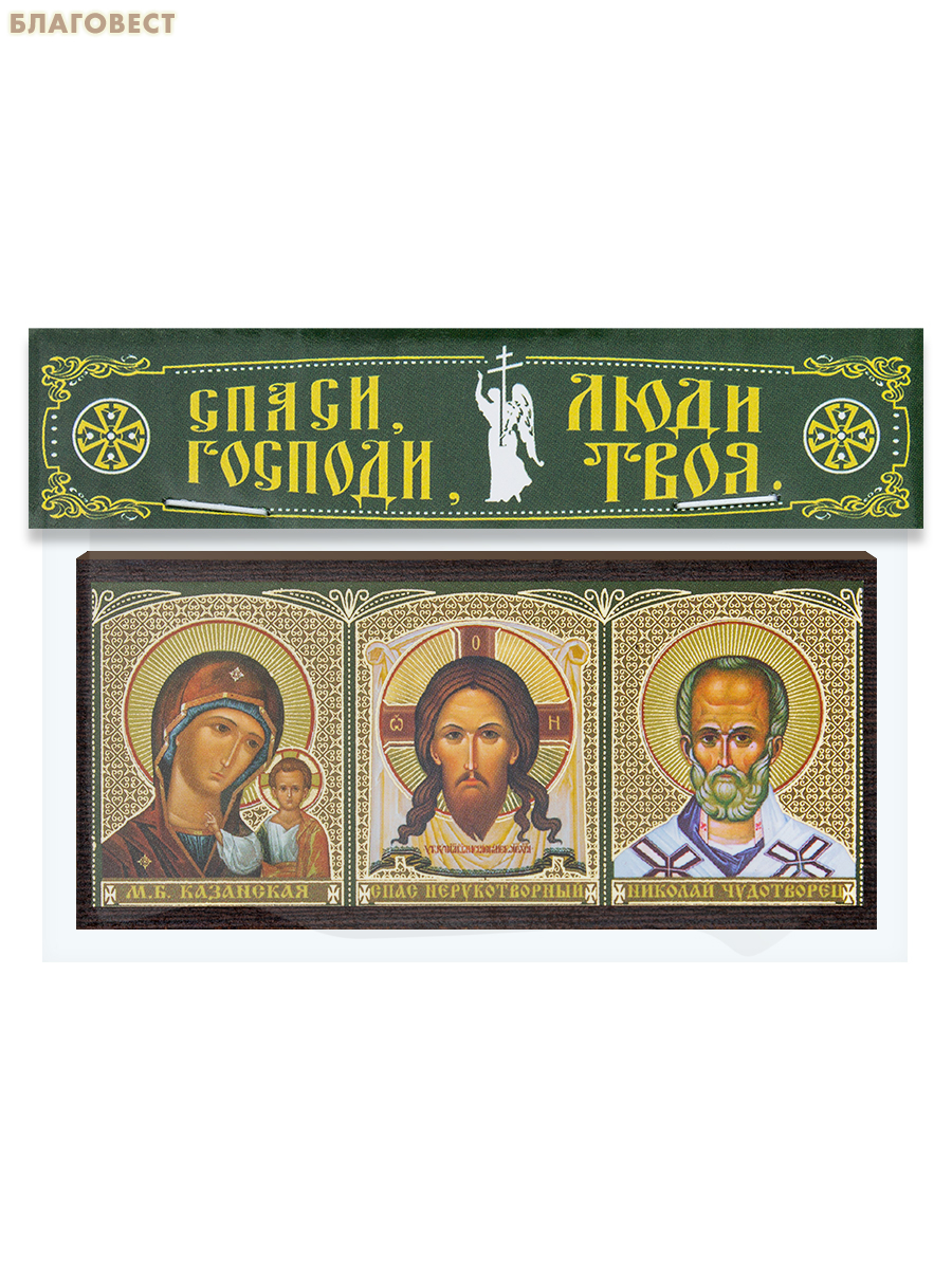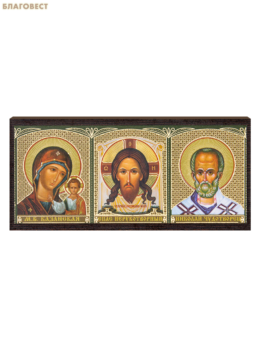 Икона-триптих автомобильная Богородица, Спаситель, Святитель Николай 9,7х4,5см, МДФ, полиграфия, скотч