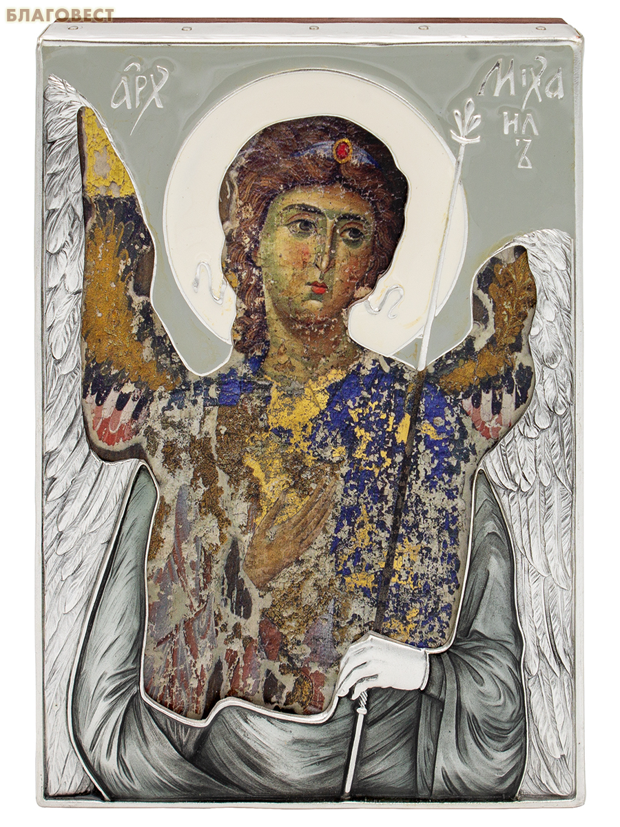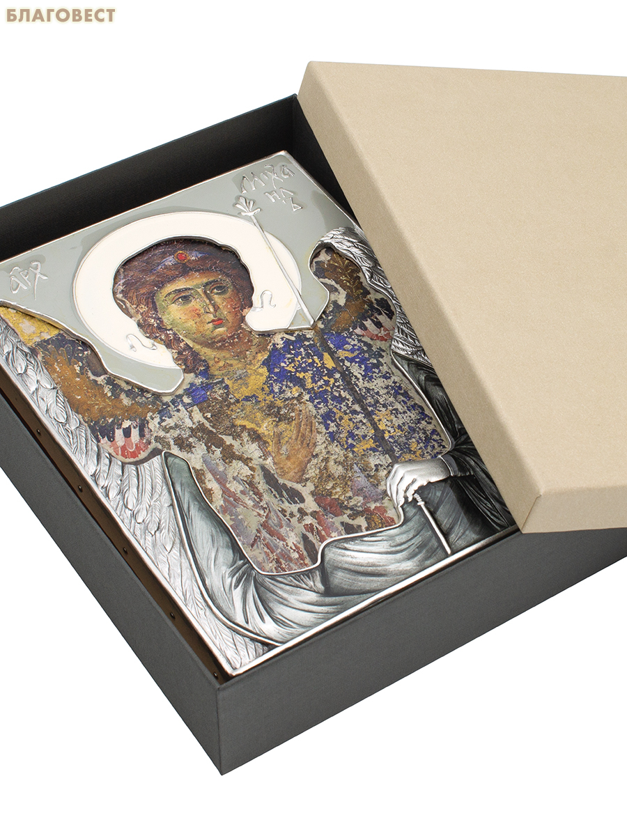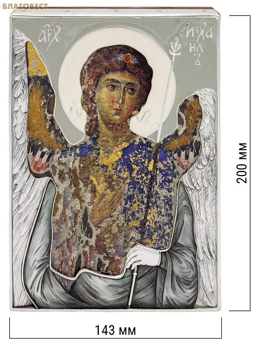 За основу этой иконы Архангела Михаила взята фреска 12 века из грузинской церкви Мацхвариши. Утраченные фрагменты изображения восполнены рельефным окладом холодной монохромной гаммы. Он визуально подчеркнул образ, придав ему объем и дополнительный свет.