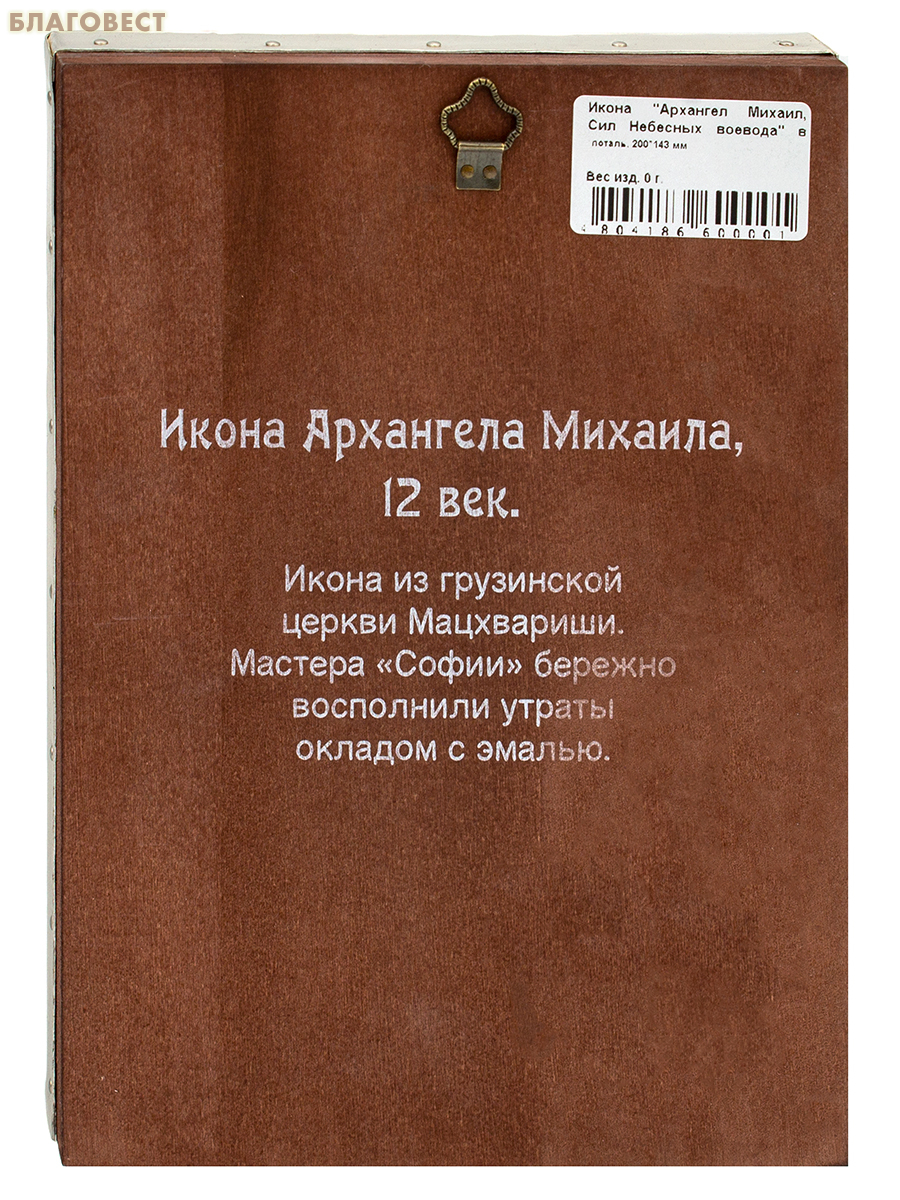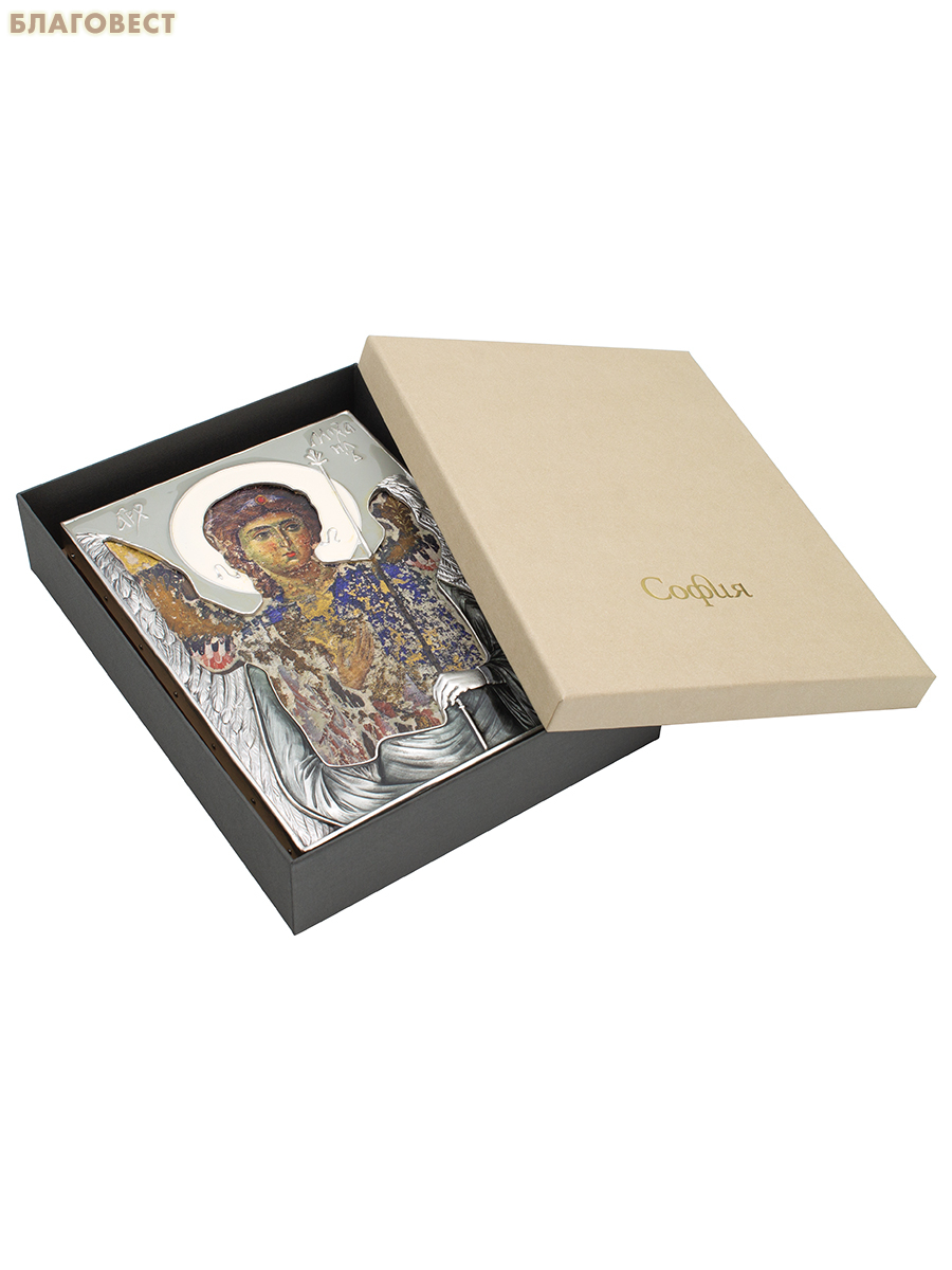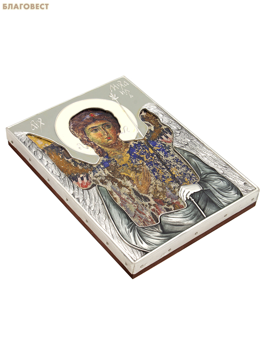 За основу этой иконы Архангела Михаила взята фреска 12 века из грузинской церкви Мацхвариши. Утраченные фрагменты изображения восполнены рельефным окладом холодной монохромной гаммы. Он визуально подчеркнул образ, придав ему объем и дополнительный свет.