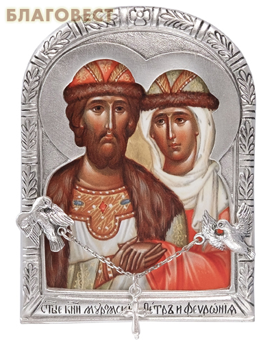 Икона в окладе «Святые благоверные Петр и Феврония Муромские», дерево, серебрение