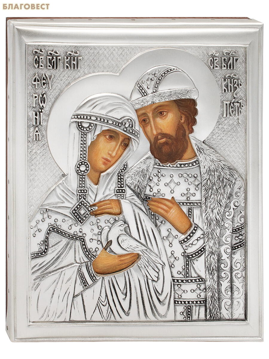 Икона в окладе «Святые благоверные Петр и Феврония Муромские», дерево, серебрение