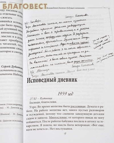 Ежедневное наблюдение не только за своими поступками и словами, но даже и мыслями, особо обращает на себя внимание в ее тетради и заставляет взглянуть на таинство Исповеди гораздо глубже - как на сокровенное желание человека исправиться и изменить свое сердце. На полях дневника рукой ее духовника отца Тихона даны наставления и советы для «Ниночки», как он всегда ласково ее называл. В книге также размещены письма-ответы архимандрита Тихона на вопросы Нины о вере и спасении души.