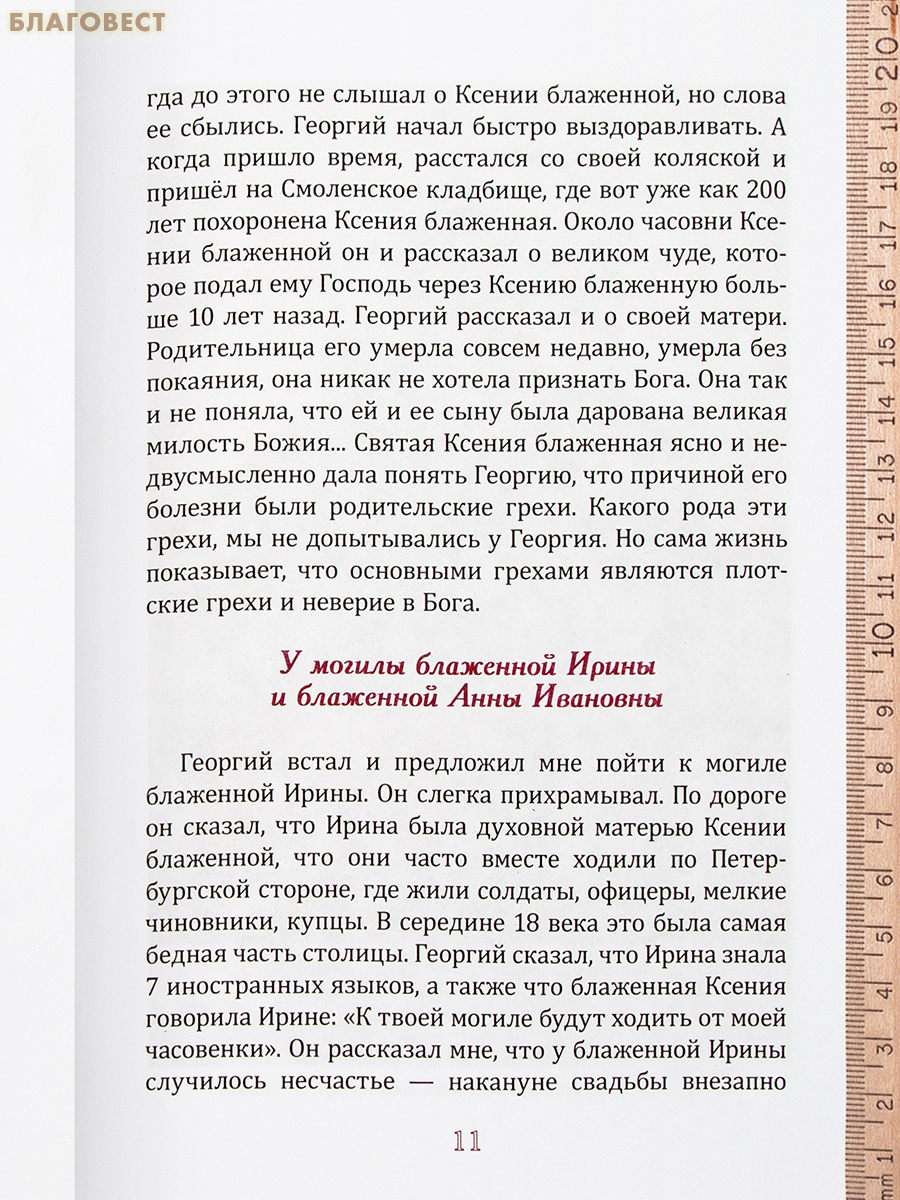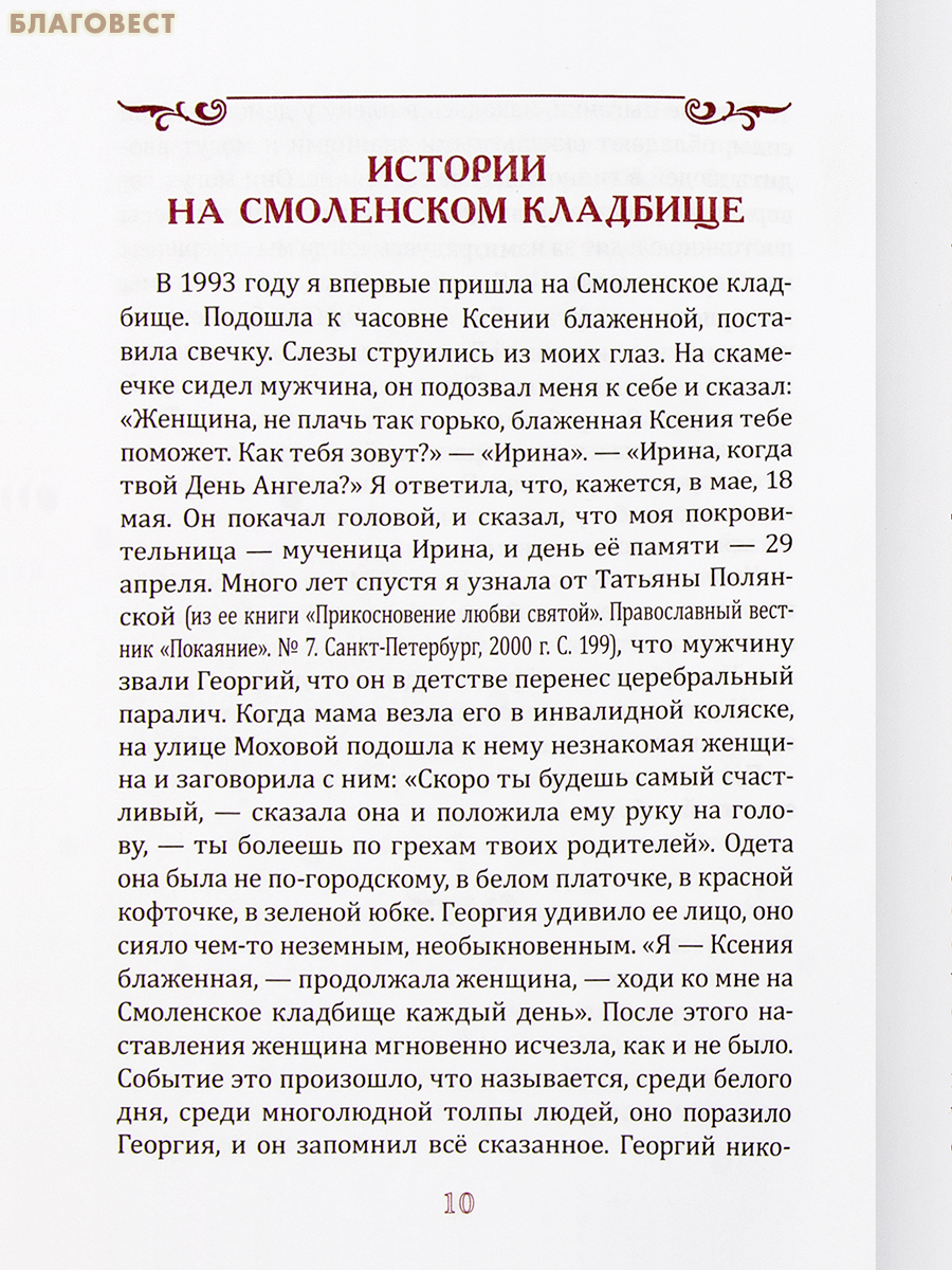 В книге Ирины Черняевой, кандидата биологических наук, представлены примеры помощи людям, с верой приходящим поклониться святой блаженной Ксении Петербургской и другим святым и подвижникам. О них, а также о многих достойных людях, похороненных на Смоленском кладбище г. Санкт-Петербурга, сохранивших православную веру в годы гонений и положивших свою душу во славу Отечества, повествует эта книга.