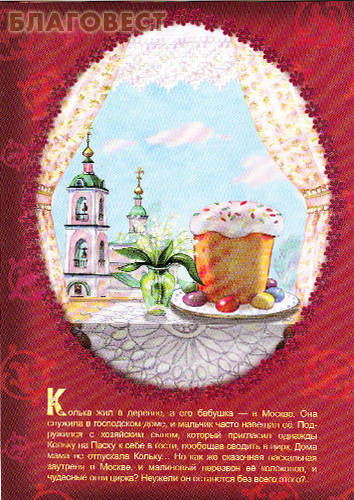 Колькина ПасхаКолька жил в деревне, а его бабушка - в Москве. Она служила в господском доме, и мальчик часто навещал ее, подружившись с хозяйским сыном, который пригласил однажды Кольку на Пасху к себе в гости, пообещав сводить в цирк. Дома мама не отпускала Кольку... Но как же сказочная пасхальная заутреня в Москве и малиновый перезвон ее колоколов и чудесные огни цирка?.. Неужели он останется без всего этого?..