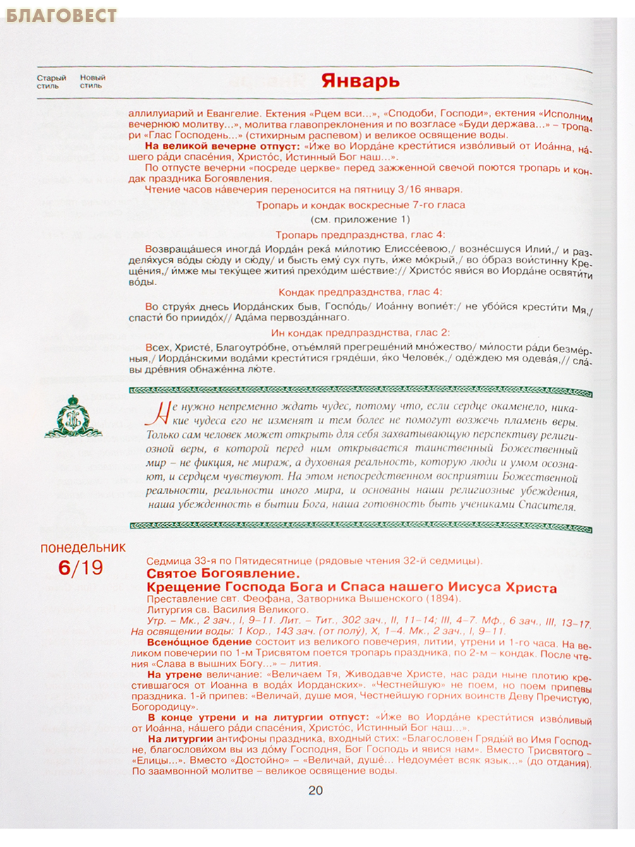 В специальных разделах календаря приводится традиционная справочная информация: о синодальных и общецерковных учреждениях, о епархиях и епископате Московского Патриархата, о зарубежных приходах Русской Православной Церкви, о духовных учебных заведениях.
