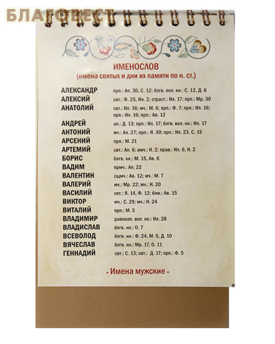 Именины, или День Ангела, – это праздник, когда мы вспоминаем своих небесных покровителей, их жизнь и подвиги. В подарочный набор «С Днем Ангела!», который можно преподнести друзьям и родным на именины, входят: икона Ангела Хранителя; настольный календарь, изготовленный в виде домика, в котором представлены даты именин, духовные советы, праздники, пасхалия на 19 лет; молитвослов с молитвами на каждый день; поздравительная открытка. Предлагаемый подарочный набор помещен в короб из дизайнерского картона с тиснением золотой фольгой.