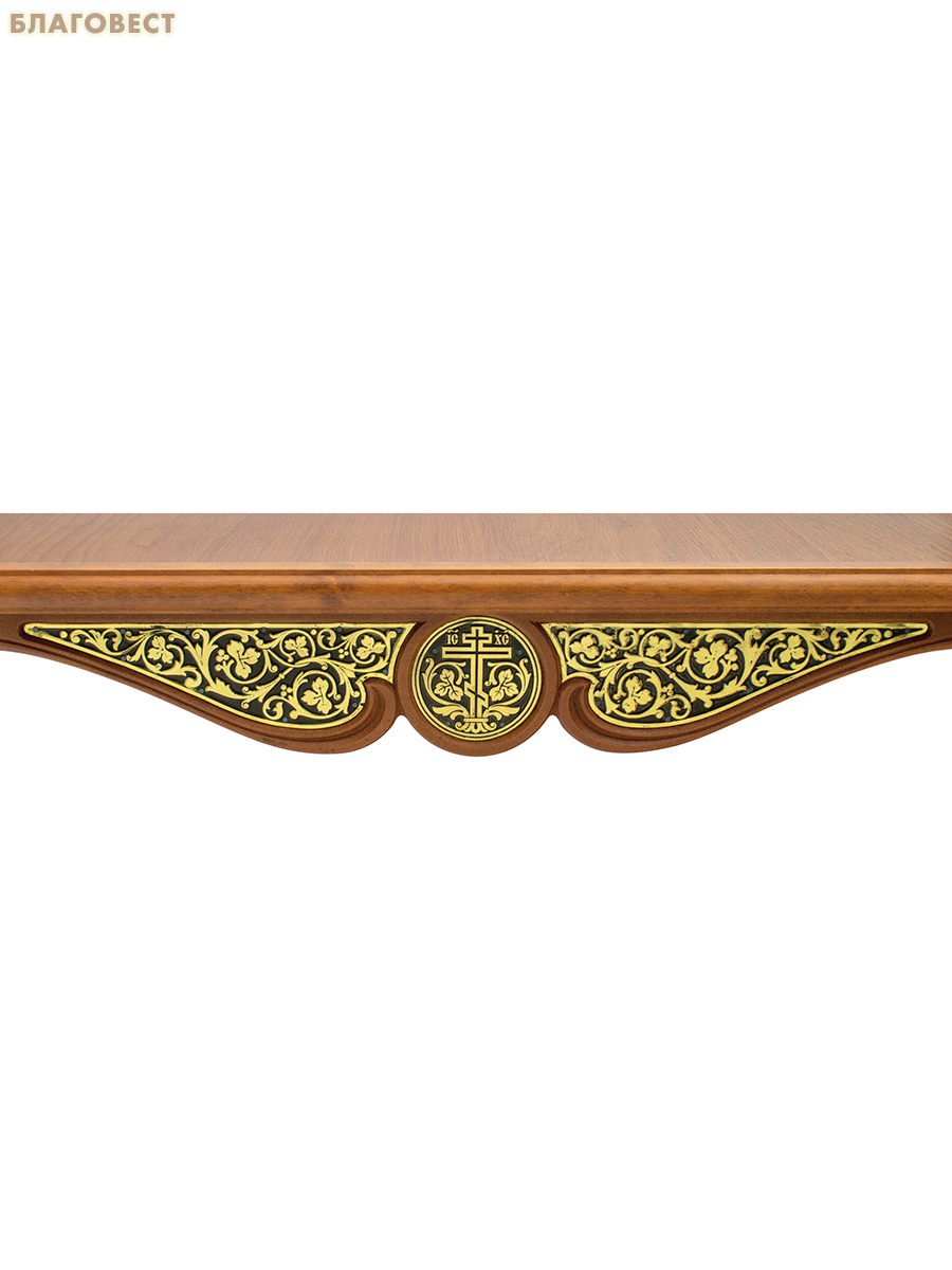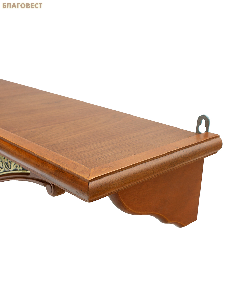 Простая и надежная настенная полка для ваших икон. Натуральное дерево в лицевой части и глубокая столешница из МДФ. Украшена традиционным декором-басмой (металлические накладки). Покрыта лаком для защиты и красивого глянцевого вида. Готовое решение для создания домашнего иконостаса.