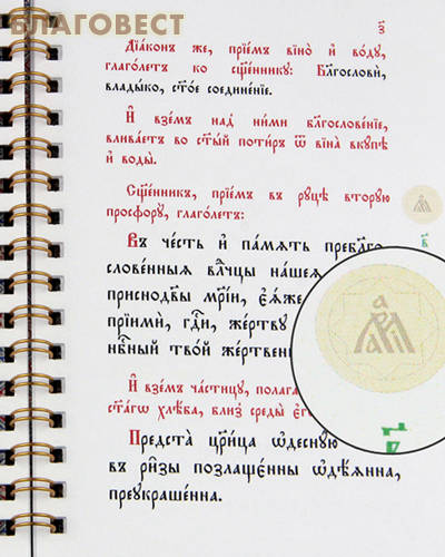 Сторонки обложки сделаны из специального запечатываемого пластика, который не боится влаги. Углы блокнота скруглены, чтобы улучшить их износостойкость. Блок напечатан на плотной мелованной бумаге (150 г) в две краски. На полях для наглядности помещены схематические рисунки просфор, которые указывают на соответствующее последованию действие.