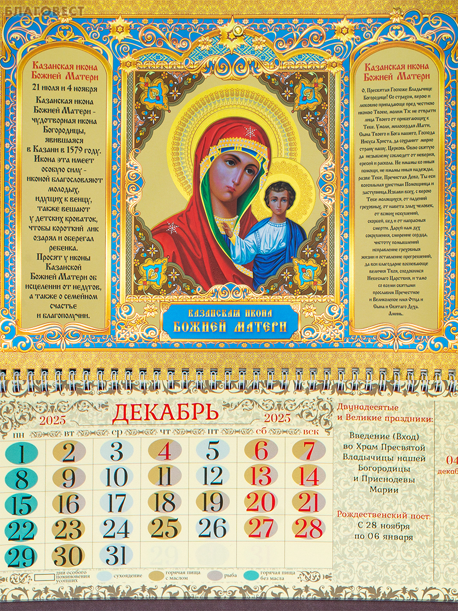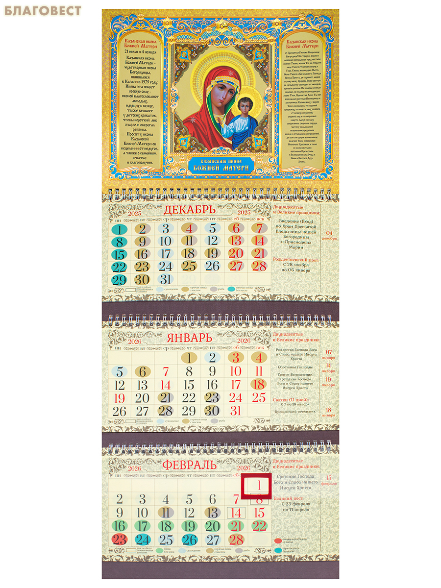 Православный квартальный календарь Пресвятая Богородица «Казанская» на 2026 год