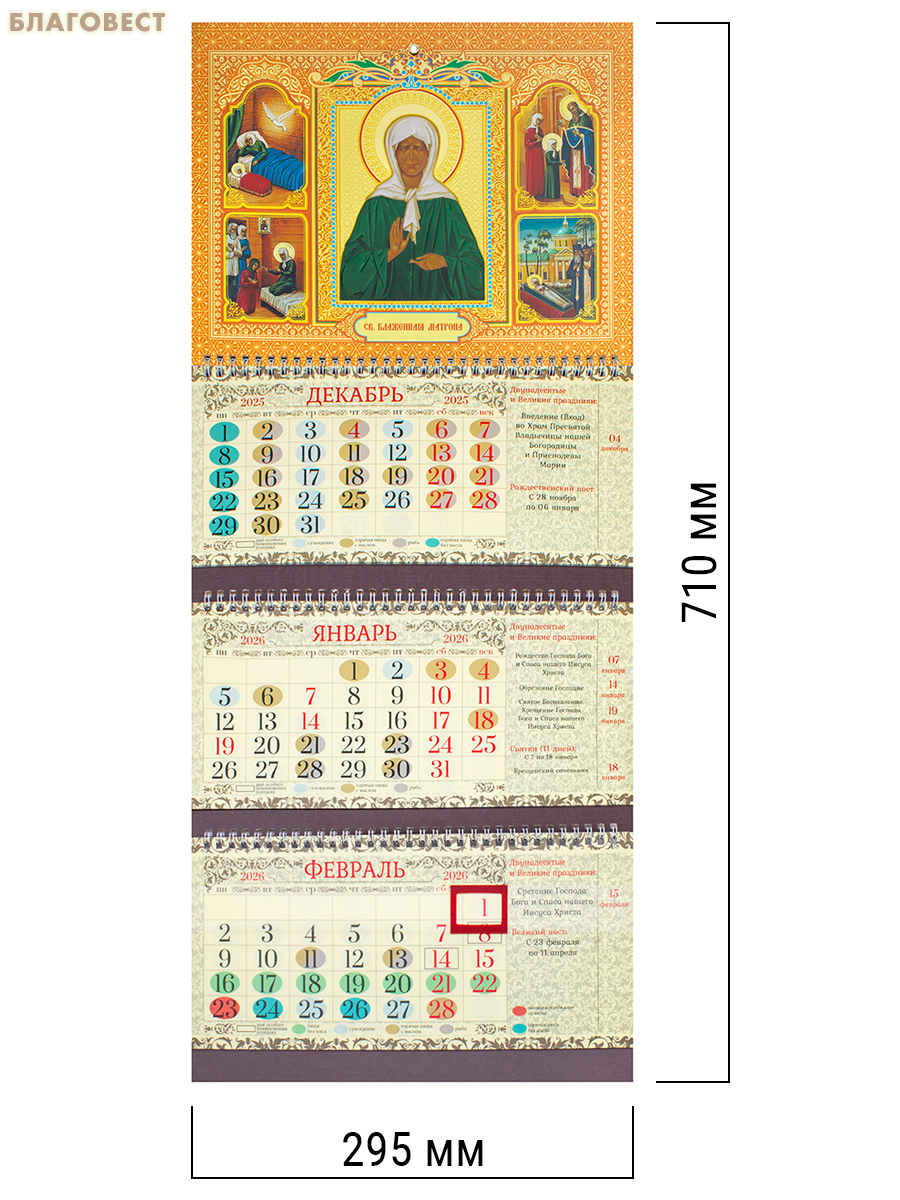 Квартальный настенный календарь на 2026 год с образом Святой блаженной Матроны Московской