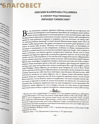 "Путешествия Гулливера" - одна из любимейших книг читающего человечества. Это произведение Свифта переведено на множество языков и пользуется успехом как у взрослых, так и в адаптированном варианте у детей. Для данного издания взят текст Свифта, максимально полно восстановленный британскими специалистами Деннисом Равенскофтом и Вильямсом Гарольдом. Первый полный перевод выполнен А. А. Франковским - блестящим мастером слова и великолепным знатоком английской литературы. Книга прекрасно иллюстрирована рисунками известного английского книжного графика Чарльза Эдмунда Брока. Точность его рисунков позволяет увидеть созданные Свифтом миры во всем объеме их мельчайших деталей.