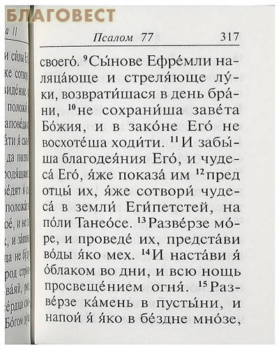 Карманный вариант псалтири кроме необходимого правила поминовения живых и усопших также содержит раздел о чтении псалтири на всякую потребу. Порядок чтения псалмов, который описан в этой главе, был создан благодаря творениям святителя Афанасия Великого и включает название требы с указанием номера конкретного псалма. Эти полезные приложения в сочетании с компактным размером книги, крупным шрифтом и удобной закладкой делают данное издание незаменимым в пути или паломничестве, позволяя прибегать к молитвенной помощи при любых жизненных обстоятельствах.