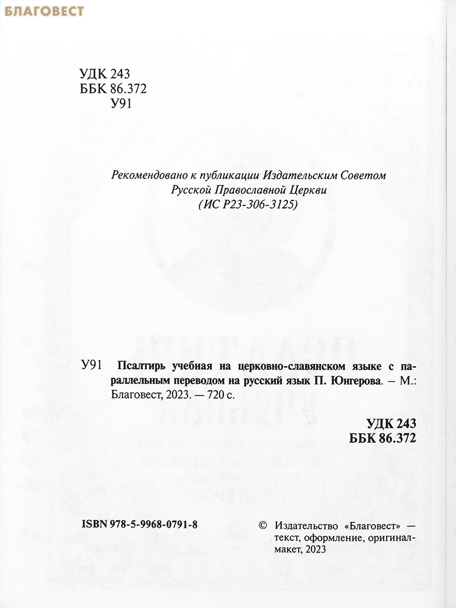 Церковно-славянский язык, созданный святыми равноапостольными Кириллом и Мефодием, является языком нашего общения с Богом в молитвах. И первоначально русские люди именно по церковно-славянской Псалтири молились Богу и вообще учились грамоте. Но далеко не все слова, обороты и тексты понятны для современного человека, да и наш современный язык, на котором мы общаемся друг с другом, весьма отдалился от своего церковно-славянского первоисточника. Поэтому П. Юнгеровым в начале 20 века был выполнен новый выверенный перевод Псалтири на русский язык — с целью максимально приблизить перевод греческой Псалтири к славянской традиции и сделать его понятным для читателей, в том числе, и для тех, кто впервые взял в руки Псалтирь. Этот перевод мы и предлагаем вниманию читателей.