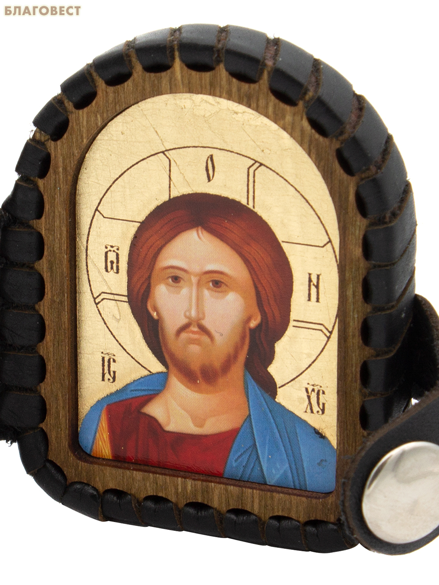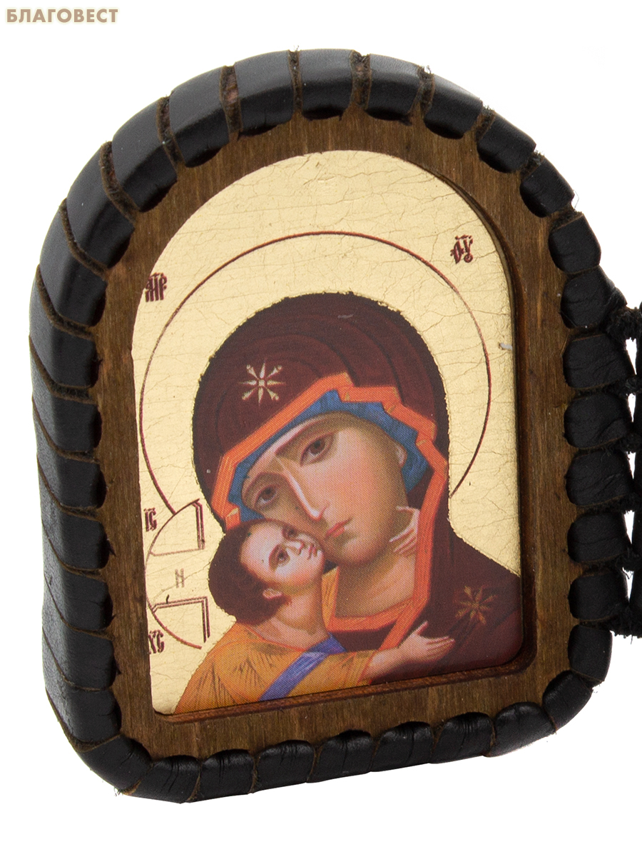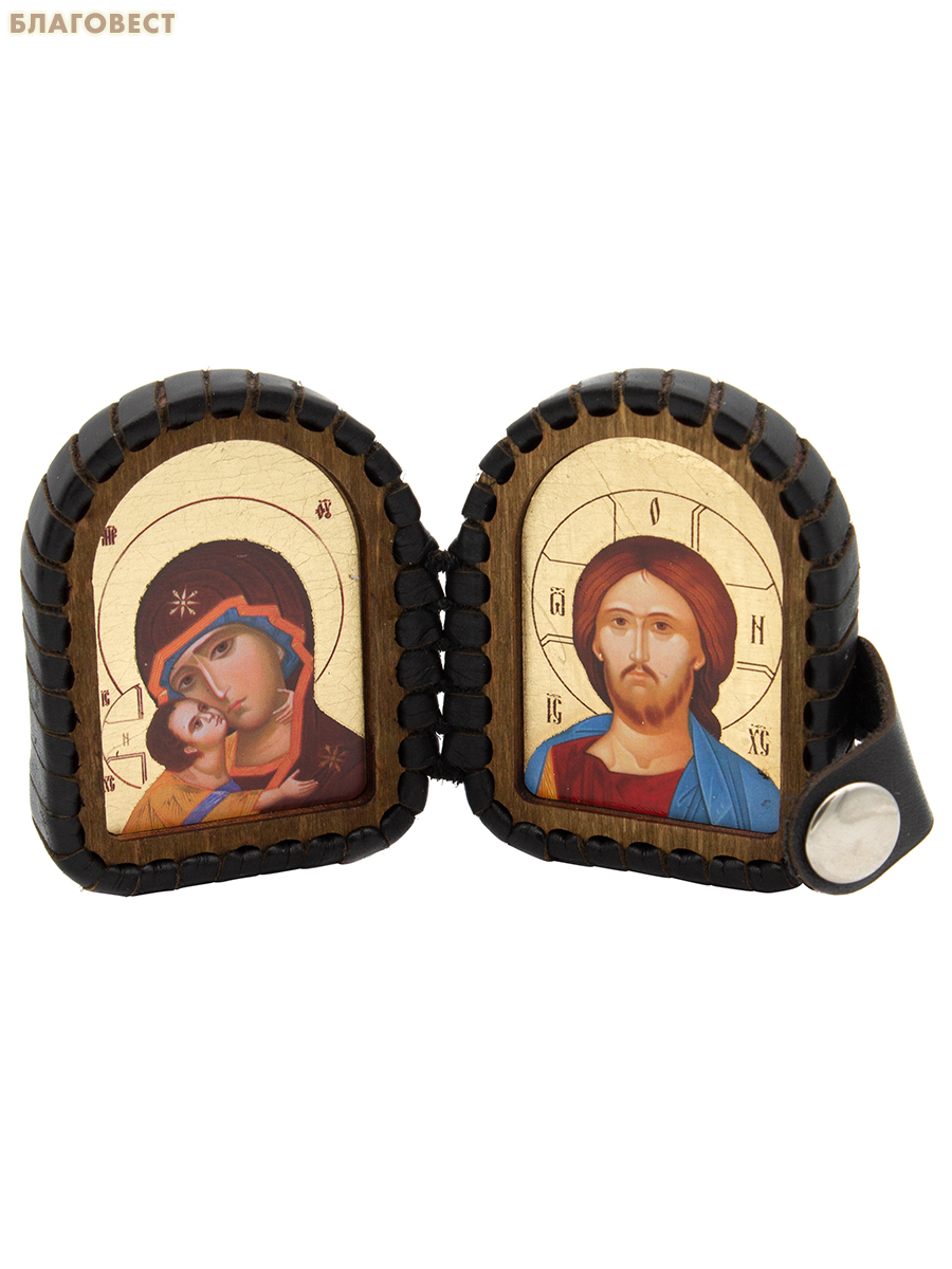 Складень кожаный Пресвятая Богородица «Владимирская» – Спаситель, размер 4,5х6см (в раскрытом виде 9,6см), дерево