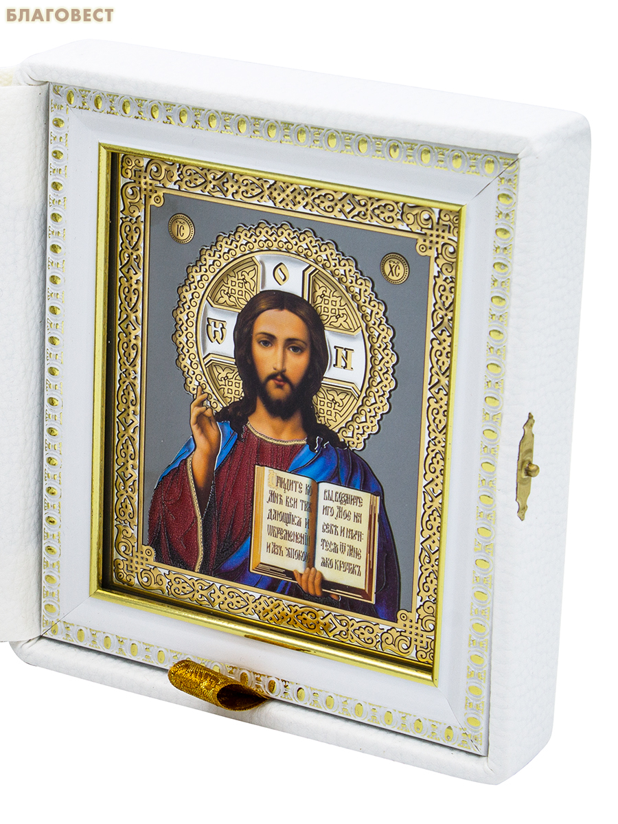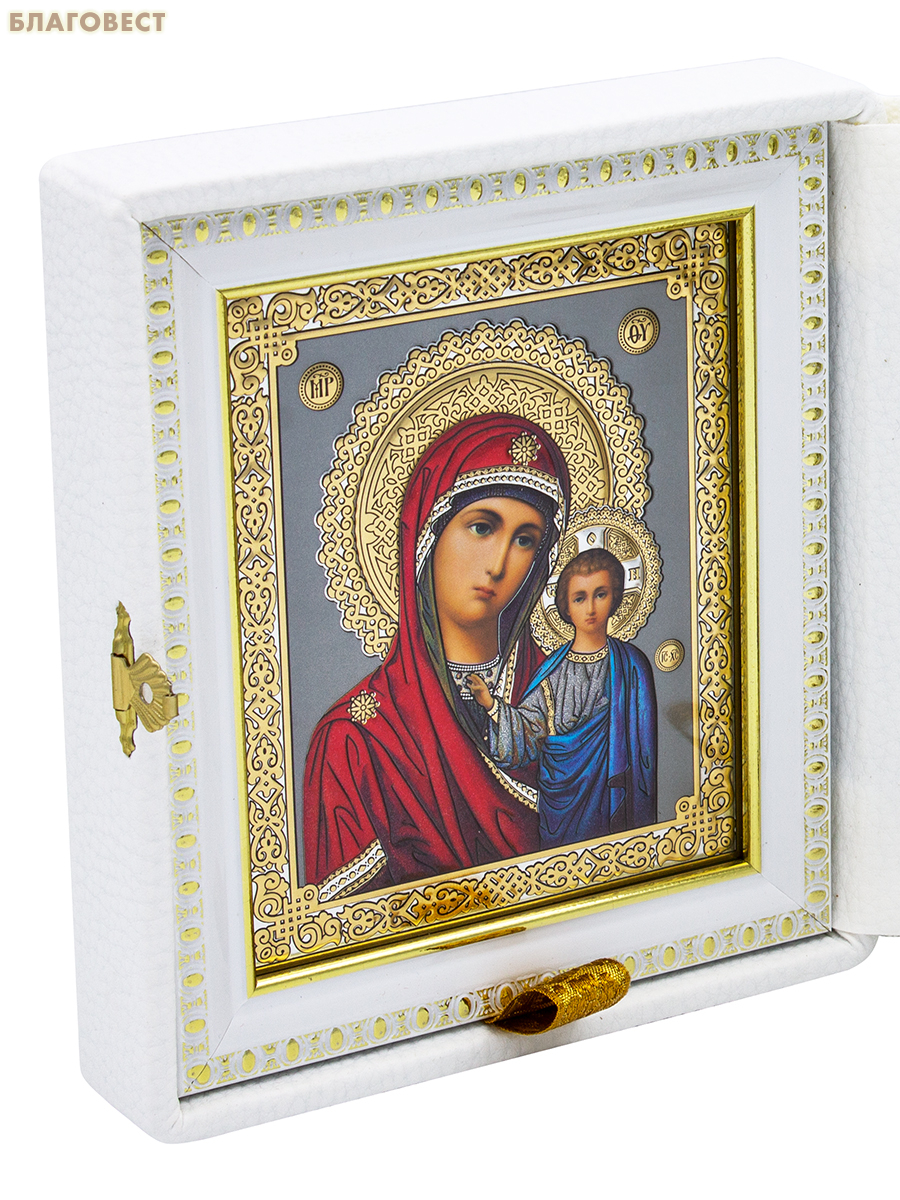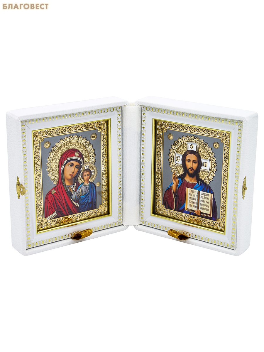 Венчальный складень "Спаситель, Казанская икона Божией Матери", дерево, эмаль, стразы, багет (в ассортименте), печать на холсте, размер в сложенном виде 14,5*18,5см
