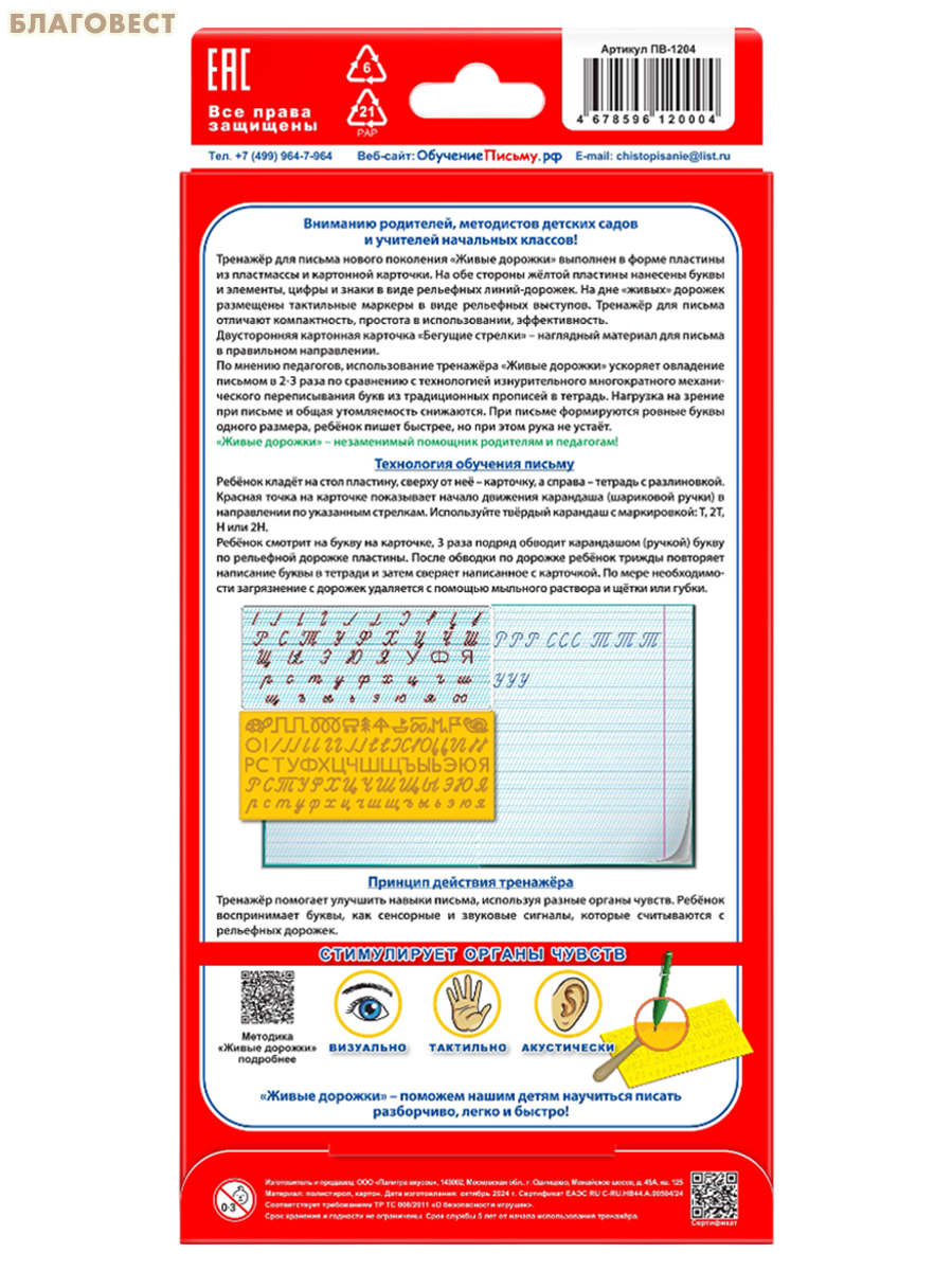 Текст представляет тренажёр как современную и эффективную альтернативу традиционным методам обучения письму. Он делает акцент на снижении стресса и утомляемости у детей, что является важным аргументом для родителей и педагогов. Инструкция понятна и описывает пошаговый процесс работы. Указание на возможность очистки пластины добавляет практичности продукту.