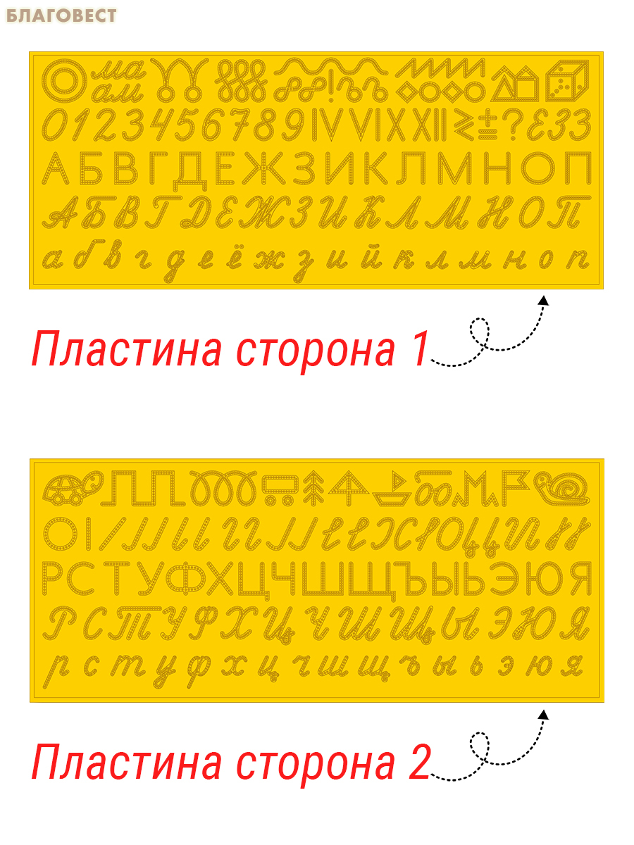 Пластина (основа): Жёлтая пластмассовая пластина с рельефными буквами, цифрами и знаками ("дорожками") на обеих сторонах. На дне дорожек есть тактильные маркеры (выступы).